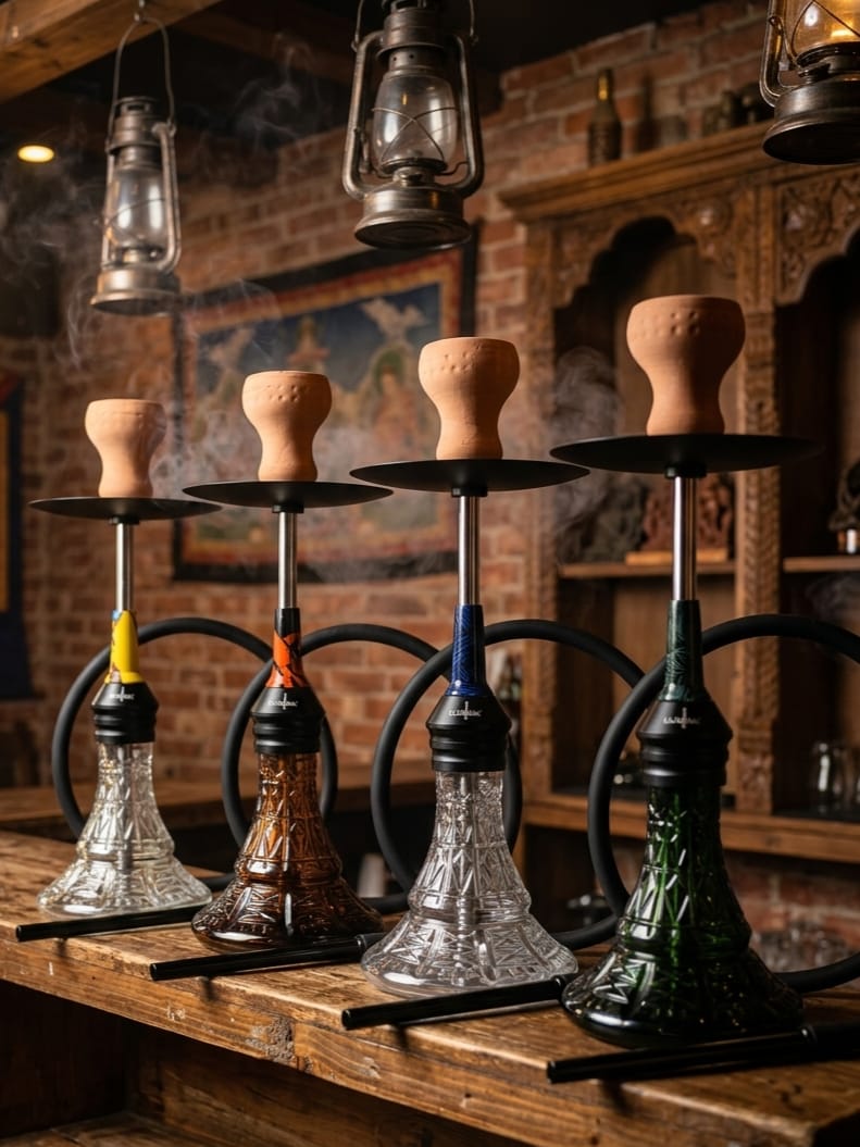 A modern premium hookah set featuring a striking emerald-green carved glass base, sleek black stem, wide tray, flexible silicone hose, and a natural wooden bowl. Designed for a smooth shisha experience with a bold, elegant tabletop presence.